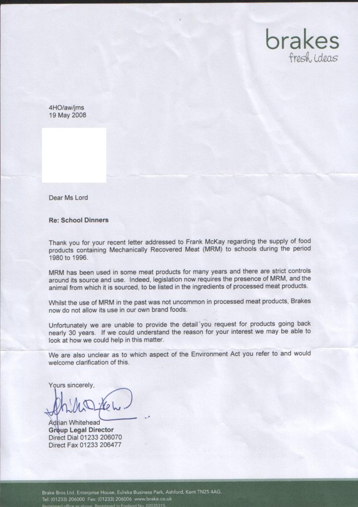 Below is a letter I received from BRAKES who supplied school meals during the 1980s and 1990s and still provide meals to schools and hospitals. I asked Brakes if they ever used MRM mechanically recovered meat in their school meal products. Below is their reply where they state ‘Brakes now do not allow its use (MRM) in our own brand products’.